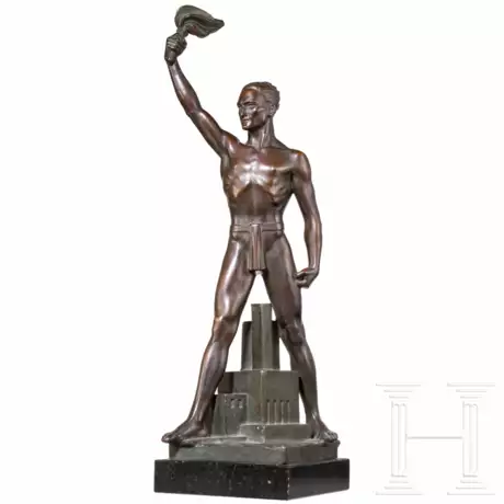 Buntmetall, braun patiniert (partiell berieben), unsigniert. Aufrecht stehender nackter Athlet, in der nach oben gestreckten rechten Hand eine lodernde Fackel, die linke Hand an der Seite zur Faust geballt. Auf schwarzem Steinsockel (minimal bestoßen). Gebrauchs- und Altersspuren. Höhe 53 cm, Gewicht ca. 5,9 kg. Ausdrucksstarke Darstellung, in der sich Siegeswille, Entschlossenheit und kämpferischer Mut widerspiegeln.