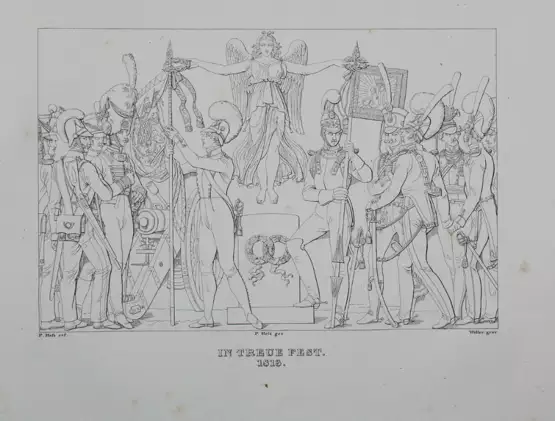 Lipperheide Sbc 23. Ornamentstichslg. Berlin 2934z. - Der lithogr. Vortitel (oder Original-Umschlag?) hier wohl auf den Einband aufgezogen. - König Max I. Joseph (1756-1825) feierte 1824 sein 25-jähriges Regierungsjubiläum. Das Werk dokumentiert die Feierlichkeiten mit ihren Festbauten und Historiengemälden. Die Tafeln von Unger, Weller, Emmert, Meyer, Päringer, Quaglio u.a. zeigen ein Porträt des Königs, Beleuchtungs- u.a. Pläne, Pokal, Oktoberfest 1810, histor. Ereignisse, Ansicht vom Maximilians-Platz, Tegernsee etc. - Etw. wasserrandig (Anfang stärker), durchgehend etw. stockfleckig.