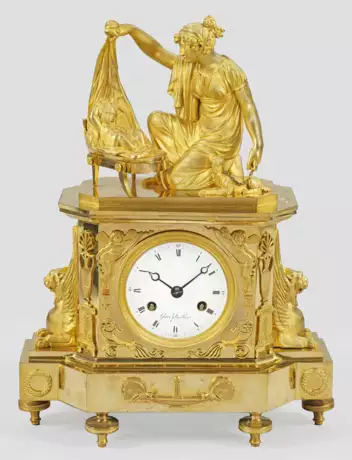 Bronze, fein ziseliert und feuervergoldet. Über gekantetem, gestuft ansteigendem Sockel mit applizierten Schmetterlingen auf Balusterfüßen, hoher Korpus flankiert von schräggestellten Ecklisenen sowie seitlich plastisch gestalteten Chimären. In der Front profilgerahmtes Emailzifferblatt, bez. Gaston Jolly à Paris, umgeben von geflügelten Genien. Skulpturale Bekrönung einer jungen Mutter ein Kind zu Bett bringend. An ihrer Seite kleiner Hund als Sinnbild für die mütterliche Treue. Pendulenwerk mit Fadenaufhängung sowie Halbstundenschlag auf Glocke. H. 41 cm. 31 cm x 14 cm.