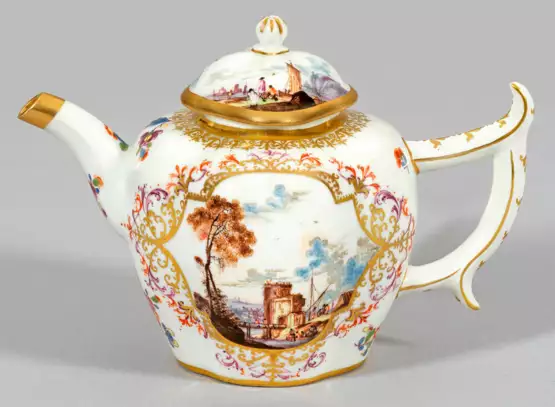 Vierpassig gewölbter Korpus mit eingezogener Schulter. Gebogter Röhrenausguss sowie J-förmig volutierter Henkel. Passig aufgewölbter, dazu passender Deckel mit Knospenknauf. Beidseitig der Wandung annährend formrezipierende, von Laub- und Bandelwerk gerahmte Goldornamentreserven mit Böttgerlüster. Darin niederländisch anmutende, architekturbestandene Hafenszenen mit Arbeitern in Booten und beim Anladen der Waren über eine Brücke mit Turm. Im Hintergrund weite Landschaft mit Windmühlen. Indianische Blütenzweige verstreut der Wandung. Auf dem Deckel vollflächiger korrespondierender Dekor. Feine polychrome Malerei wohl von Johann Georg Heintze. Formerzeichen für Andreas Schiefer. Vergolderzeichen. Rest.; Minim. ber.; Schwertermarke. H. 13,5 cm. L. 18,5 cm.