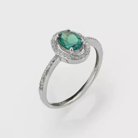 Weißgold, gest. 750. Zentral besetzt mit einem blau-grünen Turmalin von ca. 0,90 ct. im Ovalschliff, entouriert von kleinen Brillanten von zus. ca. 0,15 ct. (H/si). Gew. ca. 2,21 g.