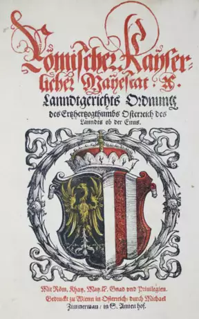 VD16 O 73 (unter Oberösterreich). Mayer I, S.79, Nr. 381. - Seltene Landgerichtsordnung von Oberösterreich mit Malefizordnung. - Titel verso gestempelt, Ebd. berieben, sonst sauber u. breitrandig.