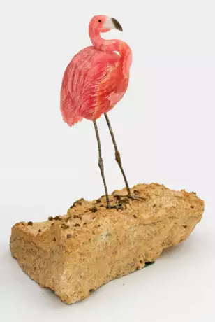 Auf einem unregelmäßigen Stein stehender, naturalistischer Flamingo. Dünne, metallene Beine, der Korpus überwiegend wohl aus fein geschnittenem Rhodonit. H. 17,5 cm. B. 16,5 cm.