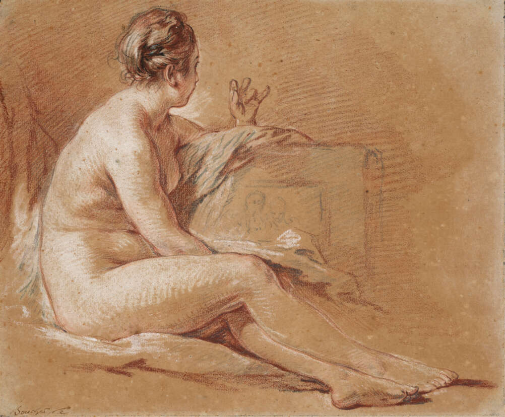 There are many female nude academies in François Boucher's drawings, whether they are preparatory to pencil engravings or paintings, or whether they are considered works in their own right, as shown here. They were already highly sought-after by collectors in the 18th century, a craze that has continued over the centuries, as demonstrated by the enthusiasm of the Frères Goncourt: 'What could be more charming than these academies of women by Boucher! They amuse, they provoke, they tickle the eye. How the pencil turns at the bend of a hip! [...] Boucher's broad chalk crosshatchings are enough to make the day flow and snake across the skin, which he seems to slash with light. [He achieves on a square of paper the charm of the most amiable nudity' (in F. Joulie, François Boucher, hier et aujourd'hui, cat. exp., Paris, Musée du Louvre, 2003-2004, p. 22). The technique, with its combination of colored chalks, the treatment of white highlights and the model's hairstyle, is reminiscent of the famous Académie de femme allongée sur une méridienne, from the former John Heseltine collection, long considered to be a portrait of Louise O'Murphy (National Gallery of Ireland, inv. NGI. 2007.3). This drawing was preparing a painting dated from 1752, which could, by comparison, give us an indication as to the dating of the present drawing.