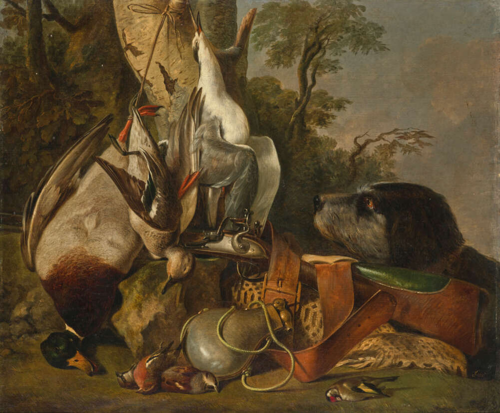 Un colvert, un chardonneret et des pinsons avec un fusil, une poudrière et un chien de chasse dans un paysage boisé