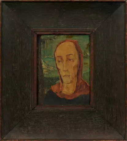 Mit feinem Pinselstrich und gedämpfter Palette gemaltes Porträt eines hageren Mannes mit melancholischem, in die Ferne gerichtetem Blick; im Hintergrund öffnet sich eine weite Landschaft mit Gebirgssee, Nadelwald, Flusslauf und Bergen. Die hier eminente nüchterne, objektivierende Darstellungsweise ist charakteristisch für die Neue Sachlichkeit, zu deren Hauptvertretern Lenk neben Otto Dix, Alexander Kanoldt, Franz Radziwill und Georg Schrimpf gezählt wird. Der Künstler studierte 1915-24 an der Dresdener Akademie bei Richard Müller. 1928 gründete er mit Kanoldt und Radziwill die Künstlergruppe "Die Sieben" und begann mit der seinen Stil prägenden altmeisterlichen Technik in Öl-Tempera-Malerei. Lenk war 1936 Vorstandsmitglied der Berliner Secession und ab 1937 Mitglied der Preußischen Akademie der Künste. Eitempera/Holz. R. u. sign. und dat. (19)29. Verso Ausstellungsetikett mit Nr. 882. 16,1 cm x 11,7 cm. Rahmen.