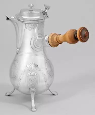 Silber. Drei geschweifte Beine mit stilisierten Huffüßen, gravierten und punzierten Blumenkartuschen an den Ansätzen und teilw. reliefierten, stilisierten Muscheln, übergehend in birnförmigen Korpus mit drei Landschaftsdarstellungen in runden Kartuschen sowie umlaufender, gravierter Girlande aus Tulpenblüten. Leicht eingezogener Hals gegliedert durch Profilbänder. Kurzer Konsolausguss, daneben graviertes Wappenschild mit ligiertem Monogramm unter Blütenkranz. Aufgewölbter, abgeflachter Scharnierdeckel mit kleinem Rundknauf, eingerollter Daumenrast und umlaufend verziert mit Perlrad. Abschraubbarer Balustergriff aus Holz. Gest. Beschau- und Meisterzeichen, Jahresbuchstabe. Meister René-Pierre Ferrier (tätig 2. Hälfte 18. Jh.). Gew. ca. 1105 g. H. 28,5 cm.