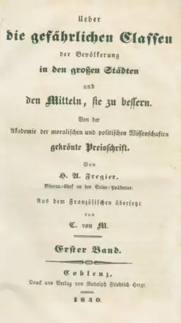 Hayn-G. II, 428. - Fromm III, 10107 - vgl. Einaudi, 2293 (franz. Ausg.).- Erste deutsche Ausgabe (im Jahr der franz. Erstausgabe), selten.- Honore Antoine Fregier (1789-1860) war ein Beamter der Stadt Paris und Verfasser einer Reihe von Werken über die Geschichte der öffentlichen Sicherheit und das Wohlergehen.- Der Autor plädiert für die Verbesserung der sozialen und wirtschaftlichen der Reform des Strafvollzugs usw.- Innendeckel mit Exlibris, Vorsatz mit hs. Besitzvermerk, etw. braunfleckig, Ebd. kaum berieben.