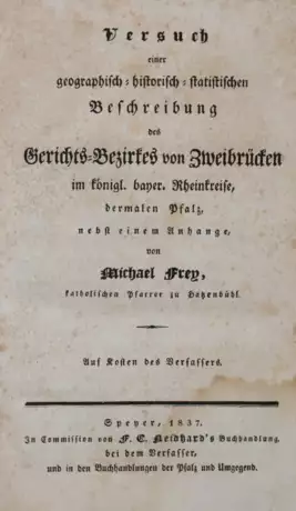 (= Versuch... des kön. bayer. Rheinkreises... Tl. 4). - Wasserrandig. Exlibris. - ╔Dabei: Molitor,L.╗ Zweibrücken, Burg und Stadt,... Zweibrücken 1879. - ╔Ders.╗ Vollständige Geschichte der ehemals pfalz-bayerischen Residenzstadt Zweibrücken... Zweibrücken 1885. - ╔Ders.╗ Urkundenbuch zur Geschichte... Zweibrücken. Zweibrücken 1888. - ╔Heintz,P.K.╗ Das ehemalige Fürstentum Pfalz-Zweibrücken während des 30-jähr. Krieges. 2. Aufl. Kaiserslautern 1895. - Zus. 5 Bde.