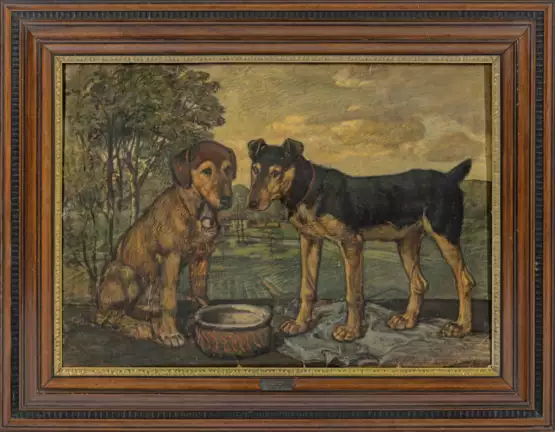 In tonigem Kolorit gemaltes, stil- und motivtypisches Werk Boehles aus dessen reifem, späten Oeuvre. Boehle, der am Städelschen Kunstinstitut in Frankfurt studierte, malte mit Vorliebe Bauern und Tiere, vorzugsweise Pferde durchziehen sein gesamtes Oeuvre. Da er seine oft auf einfache Pappen gemalten Gemälde teilweise nicht signierte, sind Stilvergleiche erforderlich. Mischtechnik/Karton, parkettiert. 83 cm x 118 cm. Rahmen.