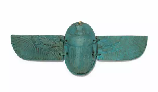 Ägypten, 26. Dynastie, Spätzeit (664–332 v. Chr.). Blaue Fayence. Dreiteilig gearbeiteter, geflügelter Skarabäus mit feiner Ausarbeitung der Details der Flügel und des Skarabäus-Körpers. Durchbohrungen zur Befestigung auf den Mumienbinden. L 17,5, H 7 cm.