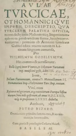 VD16 G 1913 (3 Teile). Adams 559. Göllner 1620. STC, German books 359. Brunet II, 1575. Graesse III, 76. Erste lateinische Ausgabe von Geuffroys "Estat de la court du grant Turc" (Antwerpen 1542). - Durch weitere Texte zur türkischen Geschichte ergänzte Ausgabe, herausgegeben v. Pietro Bizari, basiert auf einigen italienischen Werken, aber auch auf türkischen Quellen. - "The clearest and most authentic and intelligent picture yet available of the Turkish Empire" (Rouillard S.185). - Titel mit hs. Besitzvermerk, tls. etw. wasserrandig, Schließen fehlen, Rücken gekalkt, sonst schönes u. vollständiges Exemplar.