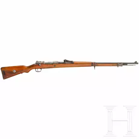 Cal. 8x57JS, SN. 2321, nummerngleich bis auf Verschluss. Leicht rauer Lauf. Div. kaiserliche Abnahmen. Brünierung patiniert und fleckig. Schloss und Hülse weiß poliert und fleckig. Magazinfeder fehlt. Unterring locker. Nussholzschaft mit deutlichen Gebrauchsspuren und "EWB" Stempel. Auf der Kolbenplatte gestempelt "59.R.3.53". Länge 125 cm.