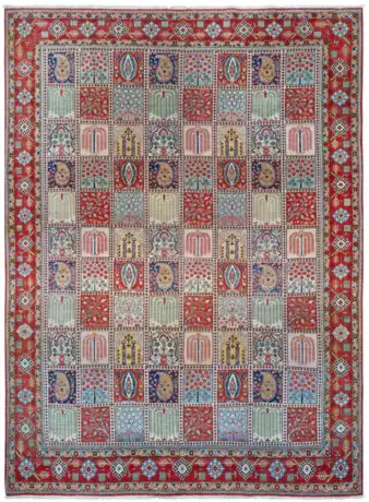 Persien. Mitte 20. Jh.; Wolle auf Baumwolle. Im Innenfeld flächendeckende Feldermusterung aus unterschiedlichen Blütenzweigen, Nischen und Bothéblüten, begrenzt von schmalen Bändern. Umlaufend hellrote Bordüre aus gereihten Rosetten und Blattwerk. 230 cm x 310 cm.