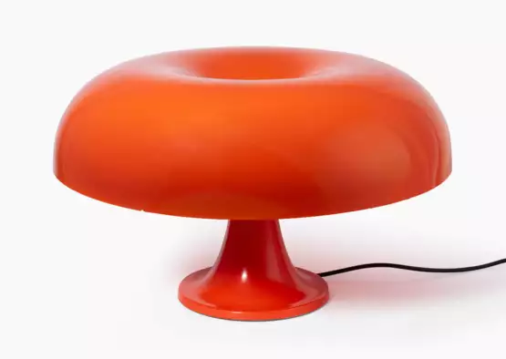 Entwurf 1960er Jahre für Artemide. Oranger Kunststoff. 4-flammig (E14). Funktionstüchtig. D 55 cm. H 33 cm.