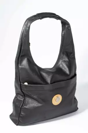 Aus schwarzem Leder. Metallbeschläge. Breiter Tragegriff. Reissverschluss. Vorderseite mit Medusa-Kopf-Dekor. 35x32x8 cm.