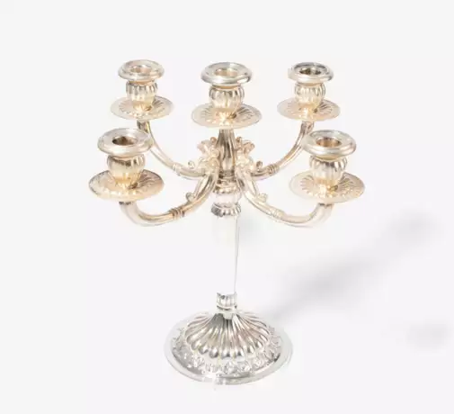 Silber (Fuss beschwert). Gemarkt San Agustin. Gewölbter Rundfuss, darüber Säulenschaft mit zentraler Vasentülle und weiteren vier geschwungenen Leuchterarmen. Mit Godronen- und Blattdekor. Feingehalt 925. H 33 cm.