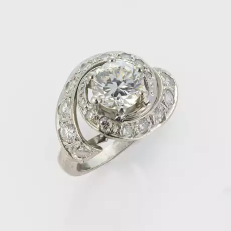 Platin. Zentral besetzt mit einem Altschliffdiamantsolitär von ca. 1,20 ct. (I-J/if-vvs), spiralartig umzogen von korrespondierenden Diamanten von zus. ca. 0,60 ct.; Gew. ca. 5,94 g.