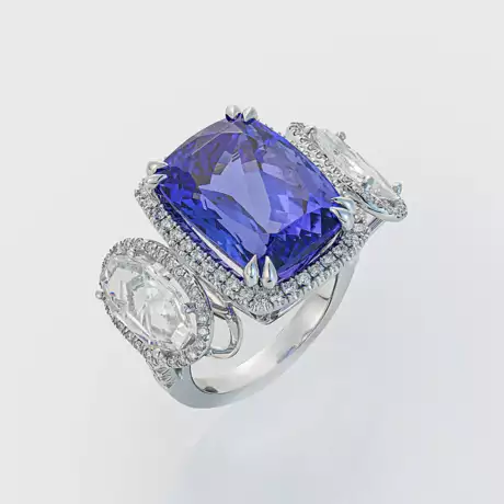 Weißgold, gest. 750. Zentral besetzt mit einem unbehandelten blau-violetten Tansanit von ca. 21,86 ct. im Radiantschliff, flankiert von 2 Diamanten von zus. 2,50 ct. (I-J/vs-si) in hexagonalem Schliff. Gew. ca. 17,60 g.