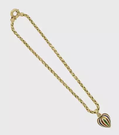 Gelbgold, gest. 750, teilw. polychrom emailliert. Zopfkette besetzt mit einem Herzanhänger und kleinen Diamanten. Gew. ca. 42,67 g.