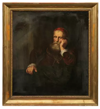 Feinmalerische, qualitätvolle Kopie des 1651 geschaffenen, bekannten Gemäldes von Govaert Flinck, das sich heute im Kunsthistorischen Museum in Wien befindet (Inv.-Nr. Gemäldegalerie, 380). Öl/Lwd.; 66 cm x 57,5 cm. Rahmen.