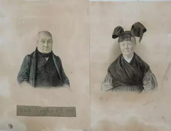 2 Portraits Markgräfler, Aquarelle. Je ca. 4°. Zus. unter einem Passep., tls. fleckig. - Dabei: 1 Photo "Markgräfler". von Ruf.