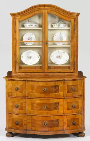 Nussbaum, furniert. Passig geschweifter Korpus auf schmaler Profilzarge und gedrückten Füßen. In der gegliederten Front drei gegenläufig geschweifte Schubladen. Entsprechende, gering überstehende Deckplatte. Weit zurückgesetzter, zweitürig verglaster Aufsatz mit geschweift ansteigendem Profilgesims. Flächendeckend breit gerahmte Furnierfelder, von Bandeinlagen begrenzt. H. 205 cm. 129 cm x 74 cm.
