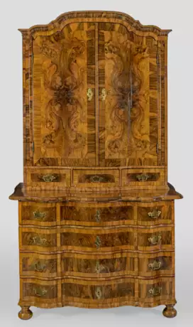 Nussbaum und Nussbaummaser, furniert. Gerader, rechteckig angelegter Korpus auf schmaler Zarge und gedrückten Füßen. In der gegliederten Front vier breite, gegenläufig geschweifte Schubladen. Passig geschweifte Deckplatte. Oberhalb weit zurückgesetzter Aufsatz mit zwei bombierten Türen und drei Schubfächern. Schmales, geschweift ansteigendes Kehlgesims. H. 217 cm. 122 cm x 69,5 cm.