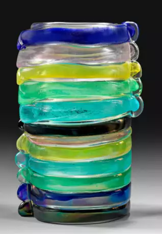 Tonnenförmiger Korpus, farbloses Glas. Dicke Bandauflagen in farblosem Glas mit Unterfang in Schwarz, Blau, Lindgrün, Türkis, Gelb und Dunkelbraun. Zum Abschluss an den Seiten gekniffen. H. 33 cm.