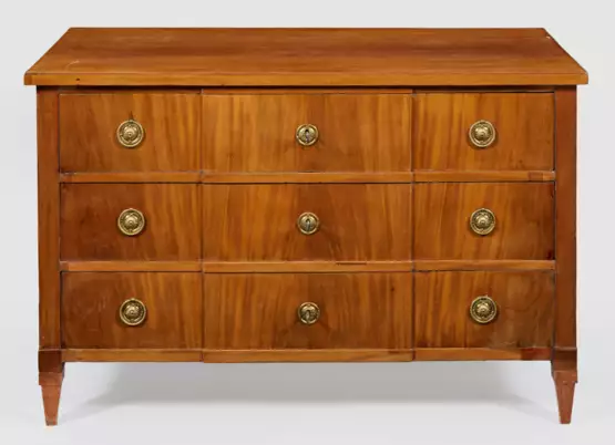 Helles Mahagoni, furniert. Gerader, querrechteckig angelegter Korpus auf konischen Vierkantfüßen. In der gegliederten Front drei breite Schubladen, durch flachen Mittelrisalit verbunden. Gering überstehende, rechteckige Deckplatte. Altersspuren. H. 82 cm. 126 cm x 62 cm.
