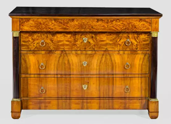 Nussbaum, furniert und teilw. ebonisiert. Gerader querrechteckig angelegter Korpus auf breiter Zarge und gekanteten Füßen. In der gegliederten Front vier, teilw. vorkragende Schubladen, flankiert von eingestellten Vollsäulen. Gering überstehende Deckplatte. H. 87,5 cm. 126 cm x 67,5 cm.