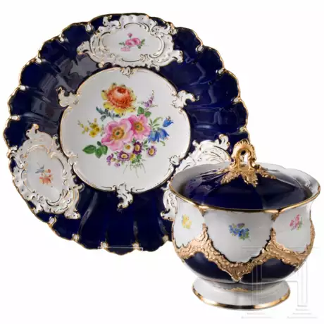Porzellan, polychrom bemalt, partiell vergoldet. Teller mit buntem Blumenbouquet im Spiegel, auf der Fahne drei rocaillengerahmte Kartuschen mit Blumenmalerei. Die Unterseite mit Schwertermarke nach 1972 (1. Wahl). Durchmesser 30 cm. Große Deckeldose (Schale), ebenfalls mit Blumenkartuschen, reliefierten und vergoldeten Rocaillen sowie partiell kobaltblau verziert. Deckel mit plastischem Knauf. Unterseite mit Schwertermarke (1. Wahl). Maße 19 x 17,2 cm.