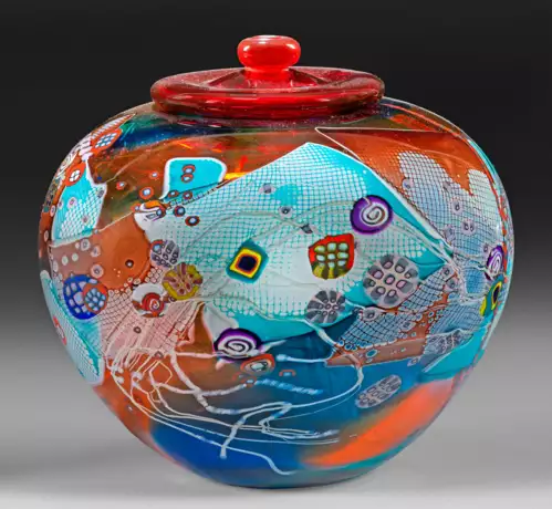 Farbloses Glas über Orange, Blau und Türkis verlaufendem Fond. Bunte Murrineneinschmelzungen sowie Fäden, Bänder und weißes Gitterwerk über türkisem Grund. Sign.; Ges.-H. 24 cm.