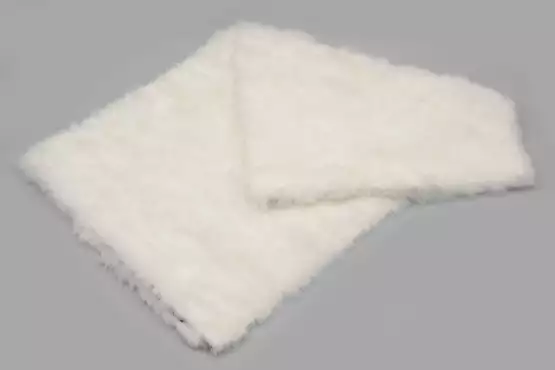 Nahezu quadratische Decke aus cremeweißer, langhaariger Cashmere-Ziege. Rückseite aus hellgrauem Woll-Cashmere. 193 cm x 188 cm.