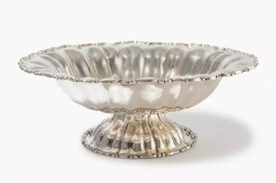 Silber. Gemarkt Real. Weite Rundform mit reliefierter Blattumrandung über gewölbtem Fuss. Wandung mit Wulstdekor. Garantiemarke, Feingehalt 925. D 40,5 cm, ca. 2010 g.