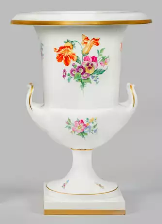 A porcelain crater vase modelled by J. C. F. Riese with flower decor. Gilding minimally restored. Sceptre and painter's mark.