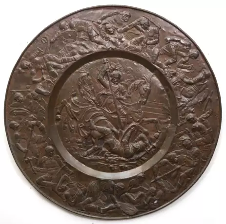 Lot 492 | Große Kupferplatte, reliefierte Ritteszenen, mit Beschädigungen, Dm. 97 cm