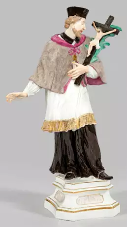 Auf passig geschweiftem, in Kartuschen marmoriertem Postament stehender Nepomuk in Soutane, in der linken Hand ein Kruzifix mit Palmzweig haltend. Polychrome Malerei mit Goldstaffage. Entw. Johann Joachim Kaendler. Modell-Nr. 337. Jahreszeichen. Schwertermarke. H. 40 cm.