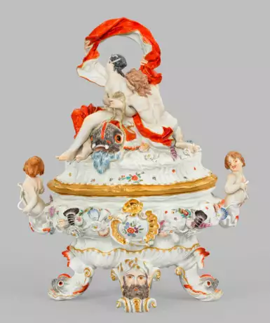 Ovale Terrine auf vier Füßen, an den Schmalseiten als Delphine, an den Längsseiten als Masken von Flussgöttern ausgebildet. Der üppig reliefierte Korpus belegt mit plastischen Muscheln, Schnecken und Korallen, an den Längsseiten muschelförmige Kartuschen, mit Blüten bemalt. Die seitlichen Handhaben in Form von Nymphen mit Fischschwänzen. Der Muschelprofil-Deckel mit Muscheln, Schnecken und Blüten belegt. Als Bekrönung eine vollplastische Figurengruppe, die Nymphe Galatea auf einem Delphin darstellend, die von ihrem Liebhaber Acis begleitet wird. Beide sind teilw. von einem roten Gewand umhüllt, das sie gemeinsam zu einer Bogenform emporwerfen, welche als Handhabe des Deckels fungiert. Polychrome Malerei mit Gold. Entw. Johann Joachim Kaendler. Modell-Nr. 05028. Jahreszeichen. Minim. rest.; Schwertermarke. H. 45 cm. B. 35 cm.