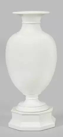 Weißporzellan. Über oktogonalem, getrepptem Postament mit rundem Fuß, ovoider Korpus mit gerundeter Schulter, in eingezogenen Hals und weit ausschwingenden Rand übergehend. Form-Entw. Julius Wilhelm Mantel. Zeptermarke. H. 40 cm.