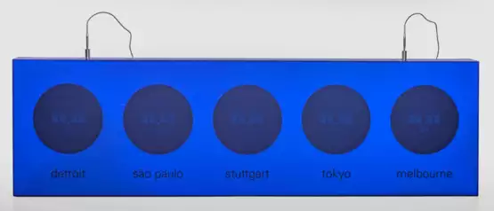 Blauer Kunststoff. Querrechteckig angelegter Korpus mit Drahtseilaufhängung. In der Front Digitalanzeige mit Zeitanzeigen unterschiedlicher Städte wie Detroit, Tokyo, Melbourne, Sao Paulo und Stuttgart. Eine Anzeige defekt. H. 85,5 cm. 295 cm x 20,5 cm.