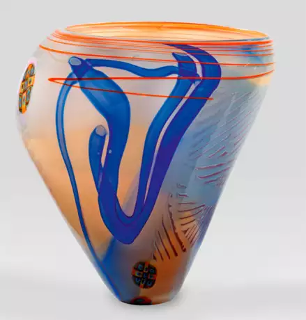Farbloses Glas über buntem, von Orange ins Flieder verlaufendem Fond. Bunte Murrineneinschmelzungen sowie Fäden, Bänder und weißes Gitterwerk. Sign.; H. 34 cm.