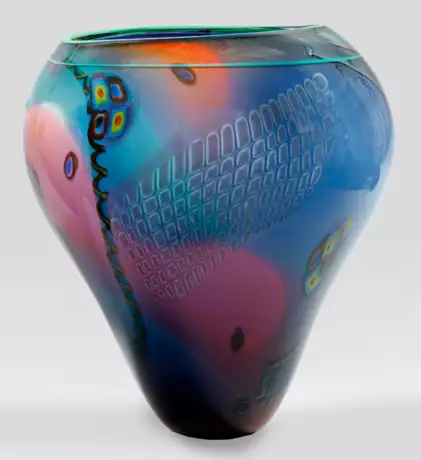 Farbloses Glas über buntem, von Grau ins Weiß und Azurblau verlaufendem Fond. Innen Azurblau. Bunte Murrineneinschmelzungen sowie Fäden, Bänder und weiß-rosafarbenes Gitterwerk. Sign.; H. 34,5 cm.