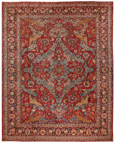 Persien. Mitte 20. Jh.; Im hellroten Innenfeld flächendeckende Ornamentmusterung in Hellblau und Gelb sowie große Palmettenblüten. Umlaufend dunkelgrundige Palmettenbordüre, begrenzt von schmalen Bändern. 312 cm x 400 cm.
