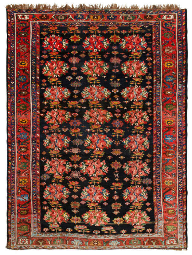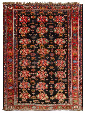 Azerbeijan. Um 1900. Wolle auf Wolle. Im dunklen Innenfeld flächendeckende Musterung aus gebündelten Rosenblüten sowie gestreuten Blüten im Rapport. Umlaufend leuchtend rote Palmettenbordüre, begrenzt von schmalen Ornamentbändern. 381 cm x 286 cm.