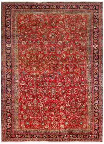 Persien. Um 1960. Wolle auf Baumwolle. Im hellroten Innenfeld flächendeckende Musterung aus dicht angeordneten Palmettenranken. Umlaufend dunkelgrundige Palmettenbordüre, flankiert von schmalen Bändern. 436 cm x 315 cm.