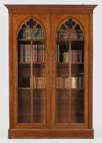 Mahagoni, furniert. Gerader, hochrechteckiger Korpus auf profiliertem Zargensockel. In der gegliederten Front zwei hohe Vitrinentüren mit ornamentierten Sprossen aus stilisiertem Maßwerk. Umlaufend breites Kehlgesims. Variable Facheinteilung. H. 230 cm. 162 cm x 55 cm.