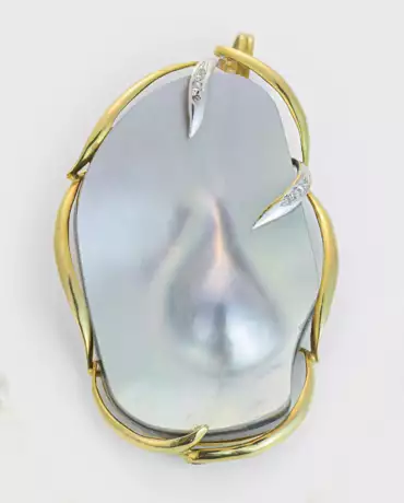 Gelbgold, gest. 585. Zentral besetzt mit einer großen flachen Biwa-Perle von ca. 57 mm x 33 mm, mit sehr farbintensivem, rosé-grün changierendem Lüster, akzentuiert von kleinen Diamanten. Gew. ca. 21,23 g.