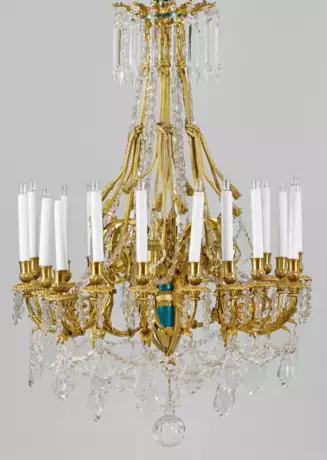 18-flg.; Bronze, vergoldet und teilw. türkisfarben lackiert sowie farbloses Glas. Gegliederter Balusterschaft, flankiert von plastischen Genienfiguren als Träger für stark geschwungene, gekantete Leuchterarme mit hohen, zylinderförmigen Tüllen. Oberhalb Streben aus stilisierten Kordeln und Quasten. Reicher Behang aus facettierten Prismen, Prismenstäben und -schnüren. Elektrifiziert. H. 110 cm. D. 75 cm.