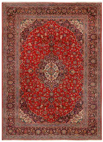 Persien. Wolle auf Baumwolle. Im roten Innenfeld gestrecktes, dunkelgrundiges Zentralmedaillon mit Anhängern sowie breite Ecklösungen. Flächendeckend dichte Blütenmusterung. Umlaufend breite, korrespondierende Bordüre. Begrenzt von schmalen Bändern. 435 cm x 322 cm.